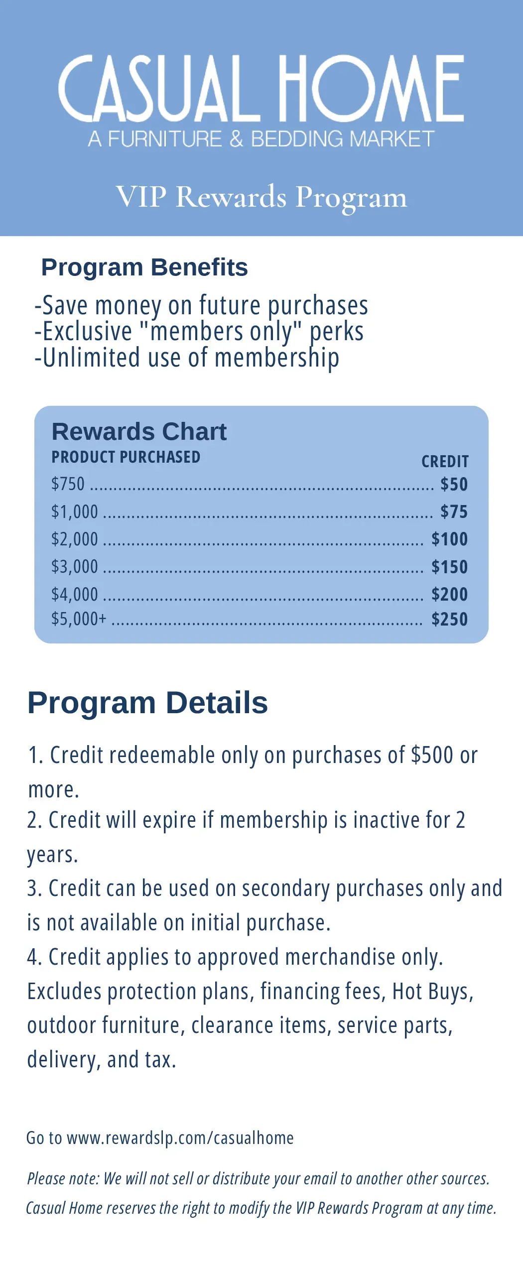 Save on future purchases! Enjoy members-only offers, 24/7 account access, and automatic enrollment. Earn up to 50% redeemable credit on secondary purchases. Stay active to keep your rewards growing! See our Rewards Chart for details. Exclusions apply.